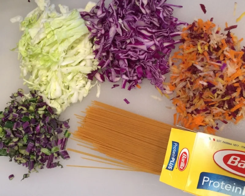 Meanwhile I cooked some thin spaghetti pasta. I like the Barilla protein plus pasta as this is a vegetarian dish and needs some protein augmentation. After cooking and draining. I lightly coated the pasta with some extra virgin olive oil.