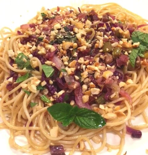I put the spaghetti on the plate and made a hole in the center. I filled the hole with the rich spicy gingered veggies. Then I topped it with chopped cashews, diced fresh mint, a final drizzle of enFuso Ginger Balsamic, and sprig of fresh mint.